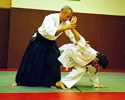 • L'immobilisation ou la projection : tori projette ou immobilise aite. L'immobilisation s'obtient à l'aide d'une clef (au bras, au poignet…). La projection s'obtient à l'aide de différents contrôles[25] au niveau du corps de aite (tête, coude, poignet…) privant ou dissuadant ce dernier de toute autre issue que la chute au sol.