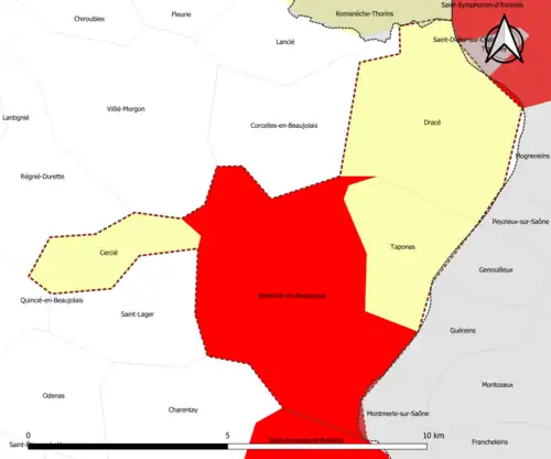 | Dracé | 69077 | Rhône | commune de la couronne | 14,87 | 1 178 (2022) | 79 | |