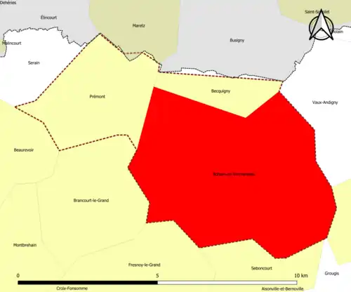 | Becquigny | 02061 | Aisne | commune de la couronne | 4,67 | 263 (2022) | 56 | |