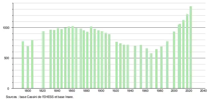 L'évolution du nombre d'habitants est connue à travers les recensements de la population effectués dans la commune depuis 1793. Pour les communes de moins de 10 000 habitants, une enquête de recensement portant sur toute la population est réalisée tous les cinq ans, les populations de référence des années intermédiaires étant quant à elles estimées par interpolation ou extrapolation[31]. Pour la commune, le premier recensement exhaustif entrant dans le cadre du nouveau dispositif a été réalisé en 2007[32].