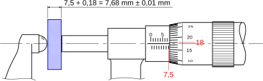 Un tour du tambour représente, en général, un demi-millimètre (0,5 mm), les graduations sur la ligne de foi sont alors espacées de 0,5 mm. À la valeur lue directement sur le corps, il convient d'ajouter la valeur lue sur le tambour gradué en 50 divisions ; 1/50 de tour de tambour correspondant à un déplacement de 1/100 de millimètre ( ).