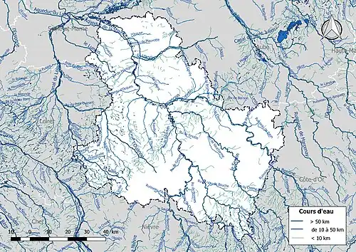 La base de données Carthage est le référentiel du réseau hydrographique français. Cette base est réalisée à partir de la couche hydrographie de la base de données Carto enrichie par le ministère chargé de l'environnement et les agences de l'eau avec le découpage du territoire en zones hydrographiques d'une part et la codification de ces zones et du réseau hydrographique d'autre part[3]. De cette base, il ressort que le réseau hydrographique de l'Yonne comprend 62 cours d'eau permanents de longueur supérieure à 10 km et dont le cours est en partie ou en totalité dans le département de l'Yonne[4].