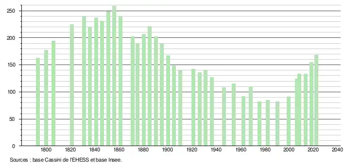 L'évolution du nombre d'habitants est connue à travers les recensements de la population effectués dans la commune depuis 1793. Pour les communes de moins de 10 000 habitants, une enquête de recensement portant sur toute la population est réalisée tous les cinq ans, les populations de référence des années intermédiaires étant quant à elles estimées par interpolation ou extrapolation[18]. Pour la commune, le premier recensement exhaustif entrant dans le cadre du nouveau dispositif a été réalisé en 2008[19].