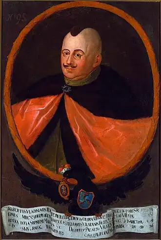 Albrycht Władysław Radziwiłł (1589-1636), fils de Mikołaj Krzysztof Radziwiłł (1549–1616) et de Elżbieta (Halszka) Euphemia Wiśniowiecka, 3e ordynat de Niasvij, pannetier de Lituanie (1620), maître-d'hôtel de Lituanie (1622), castellan de Vilnius (1633).