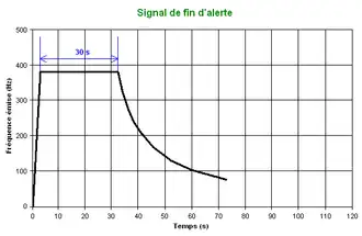 Le signal national de fin d'alerte comporte un cycle unique consistant en une seule période de fonctionnement au régime nominal (380 Hz +/- 10 Hz) d'une durée de 30 secondes.