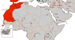 Les Almoravides[30](en arabe al-Murābitūn, المرابطون) sont une dynastie berbère, en provenance du Sahara, qui régnèrent sur le Sahara, une partie du Maghreb et une grande partie de la péninsule Ibérique (al-Andalus) (fin XIe siècle–début XIIe siècle).