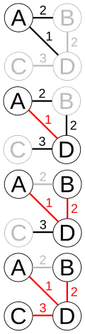 L'algorithme[7] consiste à faire croître un arbre depuis un sommet. On part d'un sous-ensemble contenant un sommet unique. À chaque itération, on agrandit ce sous-ensemble en prenant l'arête incidente à ce sous-ensemble de coût minimum. En effet, si l'on prend une arête dont les deux extrémités appartiennent déjà à l'arbre, l'ajout de cette arête créerait un deuxième chemin entre les deux sommets dans l'arbre en cours de construction et le résultat contiendrait un cycle.