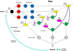 L'algorithme de Rete fournit la représentation logique globale d'une fonctionnalité d'un système de connaissance expert à partir de l'association d'une base des faits (« working memory ») avec une base de règles (« production memory ») dans un système de production de filtrage par motif (pattern matching system, une catégorie de moteur de règle). Une production se compose d'une ou plusieurs conditions et d'un ensemble d'actions qui peuvent être entreprises pour chaque ensemble complet de faits répondant aux conditions.
