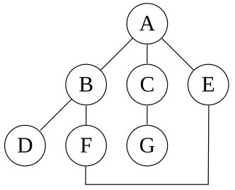 Nous conviendrons que les sommets à gauche sur ce graphe seront choisis avant ceux de droite. Si l'algorithme utilise effectivement un marquage des sommets pour éviter de tourner indéfiniment en boucle, on aura alors l'ordre de visite suivant : A, B, D, F, E, C, G.