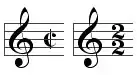 Mais dans la période baroque, l'expression n'est plus forcément prise au pied de la lettre[2]. Selon le dictionnaire de musique de Rousseau (1767), alla breve désigne « une mesure à deux temps fort vive, qui se note pourtant avec une ronde ou semi-brève par temps » et ajoute « Elle n'est plus guère en usage qu'en Italie, et seulement dans la musique d'église ». De plus, Sébastien de Brossard ajoute dans son dictionnaire (1703) « A moins qu'il ne soit marqué autrement », ce qui fait référence par exemple aux morceaux notés « ![]()