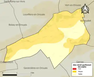 Le retrait-gonflement des sols argileux est susceptible d'engendrer des dommages importants aux bâtiments en cas d’alternance de périodes de sécheresse et de pluie. 59,9 % de la superficie communale est en aléa moyen ou fort (52,8 % au niveau départemental et 48,5 % au niveau national). Sur les 58 bâtiments dénombrés sur la commune en 2019, 45 sont en aléa moyen ou fort, soit 78 %, à comparer aux 70 % au niveau départemental et 54 % au niveau national. Une cartographie de l'exposition du territoire national au retrait gonflement des sols argileux est disponible sur le site du BRGM[17],[Carte 2].