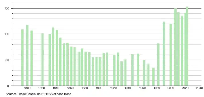 L'évolution du nombre d'habitants est connue à travers les recensements de la population effectués dans la commune depuis 1793. Pour les communes de moins de 10 000 habitants, une enquête de recensement portant sur toute la population est réalisée tous les cinq ans, les populations de référence des années intermédiaires étant quant à elles estimées par interpolation ou extrapolation[23]. Pour la commune, le premier recensement exhaustif entrant dans le cadre du nouveau dispositif a été réalisé en 2005[24].