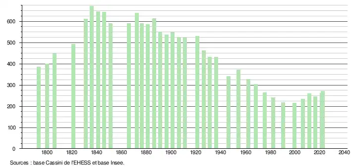 L'évolution du nombre d'habitants est connue à travers les recensements de la population effectués dans la commune depuis 1793. Pour les communes de moins de 10 000 habitants, une enquête de recensement portant sur toute la population est réalisée tous les cinq ans, les populations de référence des années intermédiaires étant quant à elles estimées par interpolation ou extrapolation[19]. Pour la commune, le premier recensement exhaustif entrant dans le cadre du nouveau dispositif a été réalisé en 2006[20].