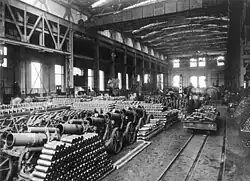 Hindenburg et Ludendorff procèdent à une refonte totale de l'économie de guerre : sous le slogan de « mobilisation totale », les ressources et moyens de production sont entièrement subordonnés aux besoins de l'industrie de guerre[86]. Ludendorff confie la direction de ce programme au colonel Max Bauer (en), son adjoint à la section des opérations de l'OHL depuis 1908, puis directeur de l'artillerie lourde et proche des milieux de la grande industrie. L'offensive franco-britannique de la Somme, de juillet à novembre 1916, bien qu'elle s'achève sur un échec des attaquants, montre que les pays de l'Entente ont considérablement accru leurs capacités en hommes et en armement, ce qui oblige le commandement allemand à surenchérir. Selon une lettre adressée par Hindenburg au ministère de la Guerre le 31 août, la supériorité de l'Entente en effectifs et en main-d'œuvre ne peut être compensée que par un recours croissant aux machines « sans tenir compte des restrictions financières ou autres[87] ». Le , les grands patrons de la sidérurgie adressent au nouveau chef d'état-major un mémorandum pour se plaindre de l'inefficacité des programmes du ministère de la Guerre, réclamant des mesures drastiques pour accroître la production. En réponse, un Office de la Guerre (Kriegsamt), rattaché au ministère de la Guerre prussien, est créé en octobre 1916 sous la direction du lieutenant-général Wilhelm Groener : il supervise les achats d'armes et de munitions, les services des matières premières (KRA), du vêtement, de l'approvisionnement de la population, parfois en concurrence avec les services homologues dépendant de l'Armée de terre, de la Marine, de l'aviation, mais aussi du ministère de l'Intérieur du Reich et des ministères des États fédérés. Le plan Hindenburg, ainsi nommé en l'honneur du chef d'état-major, est mis en œuvre à partir du printemps 1917 et pratiquement rempli à la fin de l'année : il vise à doubler la production de munitions, tripler celle de canons et mitrailleuses, augmenter d'un million de tonnes la production de charbon et de 800 000 tonnes celle de fer[88]. En décembre 1916, le gouvernement crée un comité permanent pour la fusion d'entreprises : il est destiné à résorber le trop grand nombre de petites et moyennes entreprises immobilisées ou en sous-activité, du fait de la mobilisation de leur patron ou de la pénurie de matières premières, afin de dégager des moyens pour les productions stratégiques. Très impopulaire, il est dissout moins d'un an après[89]. Pour tenir le programme industriel du plan Hindenburg, l'armée doit libérer 1,2 million d'ouvriers en septembre 1916 et 1,9 million en juillet 1917[90].