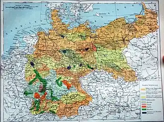 L'agriculture, protégée par des mesures protectionnistes, pour le bénéfice des junkers, et des associations paysannes, accroît ses rendements grâce aux engrais chimiques[59] : Cependant, à la veille de la guerre, l'Allemagne doit importer un tiers de sa nourriture[60]. Excédentaire en seigle et sucre de betterave, autosuffisante en pommes de terre et viande de porc, elle importe une grande partie de ses céréales et de ses fourrages. En outre, les grands domaines à l'est de l'Elbe emploient beaucoup de main-d'œuvre étrangère[61].