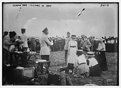 La Ligue pangermaniste atteint 130 000 membres en 1905, avec une centaine de groupes locaux[18]. La Ligue pangermaniste est longtemps favorable à une alliance avec la Russie contre le Royaume-Uni et ce n'est qu'à partir de 1912 qu'elle s'aligne sur la position officielle d'alliance avec l'Autriche-Hongrie[19]. L'Association allemande pour la défense (Deutscher Wehrverein (de)), fondée en 1912 à la suite de la seconde crise marocaine et qui atteint jusqu'à 100 000 membres, fait campagne pour le renforcement de l'armée : plutôt sceptique sur les aventures maritimes et coloniales, elle voit l'avenir de l'Allemagne dans une hégémonie sur la Mitteleuropa. Dans une partie de l'opinion allemande, par exemple dans un essai publié en avril 1912 par le général Friedrich von Bernhardi, « L'Allemagne et la prochaine guerre », la France est vue comme un pays en déclin, minée par la dénatalité et par la perte des valeurs morales, mais dangereuse par sa volonté de revanche sur la Guerre franco-allemande de 1870-1871 et sa politique d'encerclement de l'Allemagne : Bernhardi, dans la logique du darwinisme social, préconise une guerre préventive[20],[21]. Le Centre catholique (Zentrum) et les libéraux de droite sont favorables à l'expansion maritime et coloniale, sur laquelle les junkers des provinces de l'Est sont plus réservés[18]. Pour d'autres raisons, le Zentrum est favorable au soutien à l'Autriche-Hongrie, puissance catholique, dans son expansion vers les Balkans et sa rivalité avec la Russie et le royaume de Serbie[19].