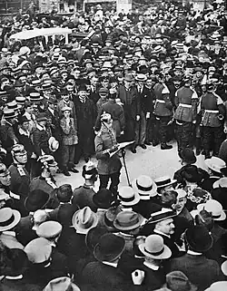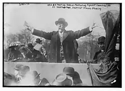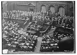 Le Congrès de l'Internationale socialiste, qui se tient à Bâle en novembre 1912, et où la social-démocratie allemande tient une place prépondérante, se change en manifestation contre la guerre au milieu de la crise des guerres balkaniques[25]. En 1913, les sociaux-démocrates sont le seul parti à voter contre une augmentation des effectifs militaires de 136 000 hommes ; ils contribuent pourtant indirectement à son financement, en votant pour un nouvel impôt sur l'accroissement de la fortune, alors que les partis conservateurs avaient voté contre[26]. Pendant la crise de juillet 1914, de nouveaux rassemblements pacifistes se tiennent à Berlin et Düsseldorf[24]. Mais tous les partis, socialistes compris, admettent de plus en plus la nécessité de défendre l'Allemagne contre les ambitions de la Russie et le panslavisme[27].