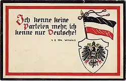 Le Parti social-démocrate, qui avait renoncé depuis 1907 à l'idée d'une grève générale contre la guerre, ne peut qu'accepter le fait accompli, sous peine d'une interdiction et d'une totale marginalisation. Le 3 août, le groupe parlementaire social-démocrate au Reichstag, par 78 voix contre 14, vote l'acceptation des crédits de guerre et, le lendemain, le député Hugo Haase, qui s'était pourtant prononcé contre les crédits, vient présenter au parlement le ralliement de son parti à l'union nationale pour empêcher une « victoire du despotisme russe » ; il réaffirme l'opposition de son parti à toute guerre de conquête et souhaite une conclusion rapide du conflit qui permette de restaurer « l'amitié avec les peuples voisins ». Sa déclaration est saluée par les applaudissements des députés et des tribunes[36]. Le ralliement des socialistes inaugure la période du Burgfrieden (diversement traduit par « paix civique » ou « paix au château »), terme médiéval qui évoque l'interdiction des conflits et luttes de partis dans une enceinte fortifiée, équivalent de l'Union sacrée en France. Les principales forces d'opposition, les sociaux-démocrates et les catholiques, acceptent de suspendre provisoirement les oppositions politiques et les antagonismes de classes[37].