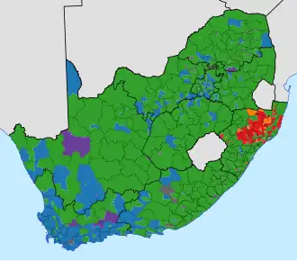 - ↑ à la suite de l'assassinat d'un conseiller municipal élu de la DA par un ancien candidat ANC, le conseil municipal, faute de quorum, a été géré par un administrateur provisoire jusqu'à l'organisation d'une élection partielleANC official in court after DA councillor shot, IOL 23 août 2016