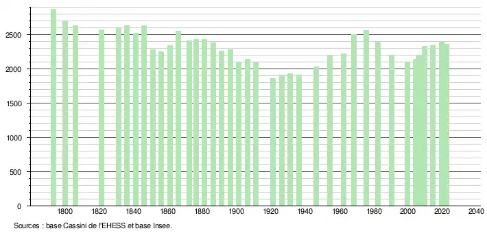 L'évolution du nombre d'habitants est connue à travers les recensements de la population effectués dans la commune depuis 1793. Pour les communes de moins de 10 000 habitants, une enquête de recensement portant sur toute la population est réalisée tous les cinq ans, les populations de référence des années intermédiaires étant quant à elles estimées par interpolation ou extrapolation[24]. Pour la commune, le premier recensement exhaustif entrant dans le cadre du nouveau dispositif a été réalisé en 2004[25].