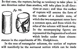 Les premières expériences et observations les plus complètes sont dues à Eaton Hodgkinson et reportées dans les Philosophical Transactions de 1840. Elles portent d’abord sur des prismes courts de bois puis de fonte qui cèdent par écrasement en se disjoignant latéralement de diverses manières, puis de colonnes qui cèdent d’une manière intermédiaire entre celle qui consiste à s’écraser et celle qui consiste à fléchir latéralement. Hodgkinson représente empiriquement les résultats par une formule de Leonhard Euler dont il fait varier les facteurs[2]. Une colonne en fonte dont la longueur varie de 0 à 5 fois le diamètre se rompt toujours par écrasement simple. Lorsque la longueur est comprise entre 5 et 25 fois le diamètre le phénomène de la rupture est mixte; il y a à la fois écrasement simple et flexion. Enfin quand la longueur dépasse 25 fois le diamètre, c’est toujours par flexion que la rupture se produit. Dès que la flexion a commencé elle tend à s’accroître rapidement même pour une faible augmentation de la compression. Lorsque les extrémités des colonnes sont encastrées la résistance est trois fois plus forte que lorsqu’elles sont arrondies[3].