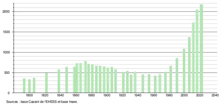 L'évolution du nombre d'habitants est connue à travers les recensements de la population effectués dans la commune depuis 1793. Pour les communes de moins de 10 000 habitants, une enquête de recensement portant sur toute la population est réalisée tous les cinq ans, les populations de référence des années intermédiaires étant quant à elles estimées par interpolation ou extrapolation[14]. Pour la commune, le premier recensement exhaustif entrant dans le cadre du nouveau dispositif a été réalisé en 2006[15].