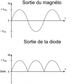 La tension alternative générée par la magnéto (1) alimente le module d’allumage, elle passe ensuite dans une diode (2) pour être redressée.