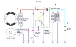 Cette description est une des variantes du système d'allumage (CDI) que l'on retrouve sur les véhicules tout-terrain (quad ou autres) ainsi que les motoneiges, jet skis et certaines motocyclettes. L'explication évoque un système alimenté directement par une magnéto, mais il existe aussi des systèmes alimentés par une tension continue régulée de 13 à 14,5 volts.