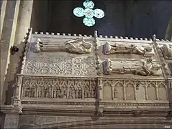 Alphonse II se prépare à la guerre et effectue un voyage à Saint-Jacques-de-Compostelle en 1196. Mais il meurt à son retour le à Perpignan. Il est inhumé au monastère cistercien de Poblet[16]. Dans son testament, fait à Perpignan en 1194, Alphonse II prévoit le partage de ses domaines entre ses deux fils. Il donne le royaume d'Aragon et le comté de Barcelone à son fils Pierre, et les comtés de Provence et de Gévaudan à Alphonse. Il lègue également de nombreux biens aux Templiers et à l'ordre de l'Hôpital. On cite notamment Pons de Rigaud parmi ses fidéjusseurs[16]. Il fait en outre don de la seigneurie de Nogaret à Guillaume de Nogaret (fils d'Ermeniard) en 1191, ancêtre du célèbre autre Guillaume de Nogaret, ministre de Philippe IV le Bel.