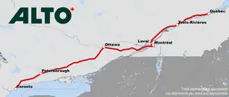 Alto (stylisé en ALTO) ou le Réseau de train à grande vitesse Québec-Toronto[4] (anglais : Toronto–Québec City High-Speed Rail Network[5]) est un projet de réseau ferroviaire à grande vitesse au Canada qui reliera la ville de Québec à Toronto. Il a été initialement annoncé par le gouvernement fédéral et Justin Trudeau le 19 février 2025. Une phase de conception du projet a été annoncée avec un coût estimé à 3,9 milliards $ CA et devrait durer entre 4 et 5 ans[6].