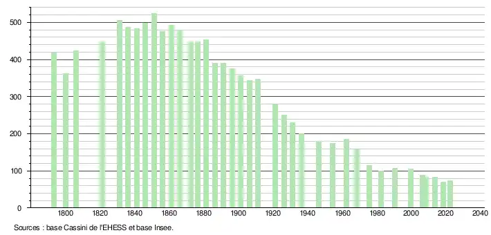 L'évolution du nombre d'habitants est connue à travers les recensements de la population effectués dans la commune depuis 1793. Pour les communes de moins de 10 000 habitants, une enquête de recensement portant sur toute la population est réalisée tous les cinq ans, les populations de référence des années intermédiaires étant quant à elles estimées par interpolation ou extrapolation[16]. Pour la commune, le premier recensement exhaustif entrant dans le cadre du nouveau dispositif a été réalisé en 2008[17].