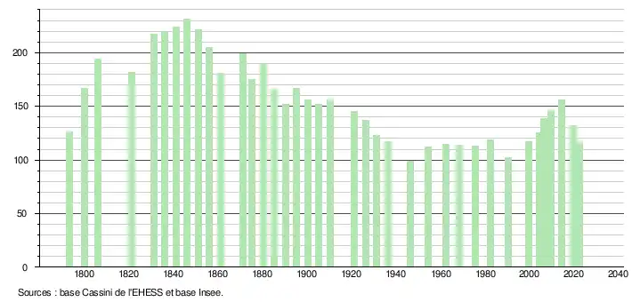 L'évolution du nombre d'habitants est connue à travers les recensements de la population effectués dans la commune depuis 1793. Pour les communes de moins de 10 000 habitants, une enquête de recensement portant sur toute la population est réalisée tous les cinq ans, les populations de référence des années intermédiaires étant quant à elles estimées par interpolation ou extrapolation[18]. Pour la commune, le premier recensement exhaustif entrant dans le cadre du nouveau dispositif a été réalisé en 2004[19].