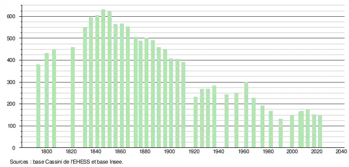 L'évolution du nombre d'habitants est connue à travers les recensements de la population effectués dans la commune depuis 1793. Pour les communes de moins de 10 000 habitants, une enquête de recensement portant sur toute la population est réalisée tous les cinq ans, les populations de référence des années intermédiaires étant quant à elles estimées par interpolation ou extrapolation[19]. Pour la commune, le premier recensement exhaustif entrant dans le cadre du nouveau dispositif a été réalisé en 2007[20].