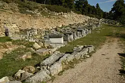 - ↑ La stoa est datée par la forme des chapiteaux doriques.
