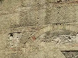 Du bâtiment adossé à la gauche de la Porta Pompae, la natatio, les sols (mosaïque en échiquier et figures de dauphins, opus spicatum et hexagones), une inscription en mosaïque et des restes de fresques sont visibles. Les vestiges de ce bâtiment sont protégés par une toiture moderne.