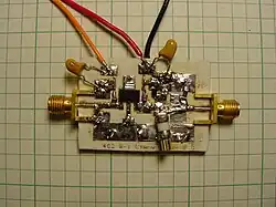 Les amplificateurs de puissance RF modernes utilisent des dispositifs à semi-conducteurs, principalement des MOSFET (transistors à effet de champ métal-oxyde-semi-conducteur)[3],[4],[5]. Les premiers amplificateurs RF basés sur MOSFET remontent au milieu des années 1960[6]. Les transistors à jonction bipolaire étaient également couramment utilisés dans le passé, jusqu'à ce qu'ils soient remplacés par des MOSFET de puissance, en particulier des transistors LDMOS, comme technologie standard pour les amplificateurs de puissance RF dans les années 1990, en raison des performances RF supérieures des transistors LDMOS.