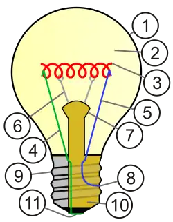- À la différence de température avec l'ambiante correspond une dilatation thermique. Le coefficient de dilatation du tungstène est de 4,2 × 10−6 K−1[9]. L'échauffement rapide de 2 470 K à l'allumage s'accompagne d'une augmentation de la longueur du filament de 1 %. Comme celui-ci a une forme hélicoïdale, cet allongement est sans conséquence. Le coefficient de dilatation du tungstène est proche de celui du verre, ce qui limite les contraintes à la traversée de l'ampoule.