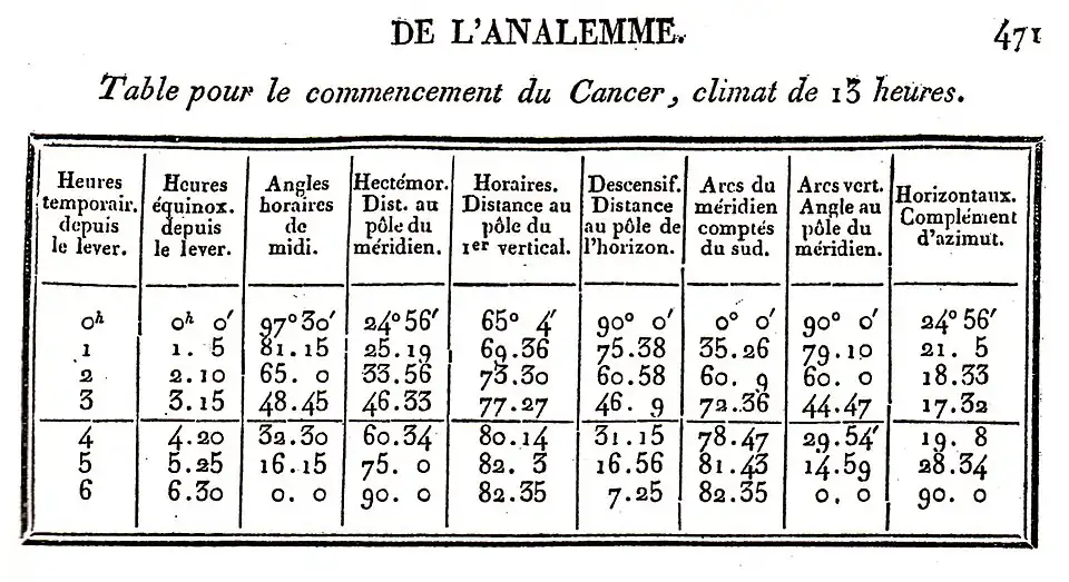 Ce dernier donne ensuite une table où ces valeurs sont tabulées pour un climat (latitude) et une date (longitude du Soleil) donnés[N 5].