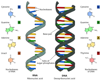On distingue les bases pyrimidines et purines. Elles sont capables de s'apparier grâce à deux ou trois liaisons hydrogène entre une fonction cétone) et une fonction amine ; elles peuvent aussi s'empiler par l'action de leurs cycles aromatiques (interaction de π-stacking).
