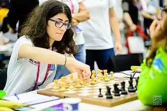 - en 2014, à Batoumi, en Géorgie lors du championnat d'Europe d'échecs de la jeunesse dans la catégorie des filles de moins de 14 ans[3].
