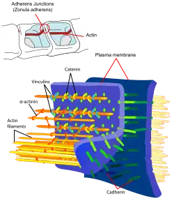 Plusieurs protéines membranaires comme l'occludine, diverses claudines et molécules d'adhésion de jonction (JAM sous leur sigle anglophone) relient les cellules endothéliales dans la région apicale des parois cellulaires latérales en bandes de protéines qui font un tour complet, et se connectent en jonctions serrées, qui interdisent largement le transport de matières entre les membranes cellulaires endothéliales[27] Les liaisons protéine-protéine travaillent comme des sécurités en parallèle, c'est-à-dire perdent leur efficacité dès que l'une cède.