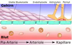 Les pieds des astrocytes forment un contact en filigrane de rosettes sur les cellules endothéliales. Cet arrangement est important pour l'influence réciproque et la communication entre les deux types de cellules. C'est ainsi qu'une diffusion libre est rendue possible entre les cellules endothéliales et le parenchyme cérébral[54].