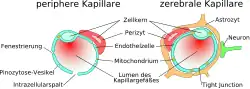 Les capillaires sont tapissés – comme les vaisseaux périphériques – de cellules endothéliales. L'endothélium des capillaires périphériques possède, pour l'échange de l'eau et des matières qui y sont dissoutes ou en suspension entre le sang et le liquide intercellulaire du tissu environnant, des ouvertures (fenêtres) d'environ 50 nm de diamètre et des fentes entre cellules de 0,1 à 1 µm de large. Entre les cellules endothéliales du cerveau, il n'y a au contraire aucun fenestrage, ni fente intercellulaire[4], ce pourquoi on parle aussi d'un « endothélium continu »[5]. La membrane cellulaire du côté de l’intérieur du capillaire (« luminale ») diffère considérablement du point de vue de la composition en protéines de celle de la membrane du côté du tissu interstitiel (« apicale »).