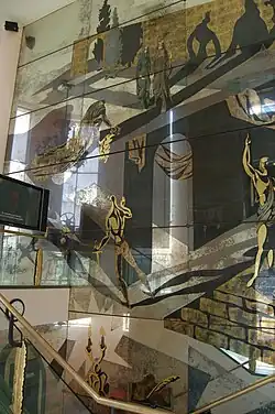 Réalisé après la construction du bâtiment, et posé en 1956, ce miroir, ou "damier" pour reprendre les termes de l'époque, est l’œuvre des ateliers parisiens de Robert Pansart, (1909-1973) d'après un carton du peintre français d'origine serbe André Grozdanovitch (1912-1997)[16].