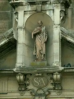 Statue de saint Acceul (SA) portant une scie (instrument de son supplice), sur le fronton de l'église d'Écouen.