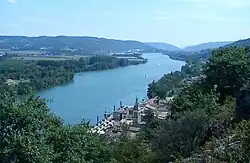 D'est en ouest, sa « largeur » est plus modeste. Son territoire comprend l'étroite plaine fertile de la rive droite et monte jusqu'au bord supérieur du plateau, en limite avec les communes de Saint-Désirat, Saint-Étienne-de-Valoux et Talencieux[1].