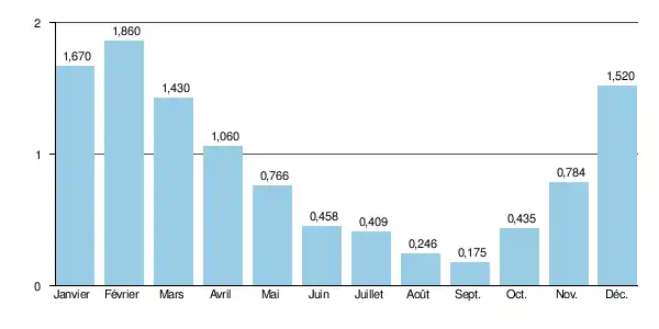 Cependant, à l'étiage, le VCN3 peut chuter jusque 0,045 m3, en cas de période quinquennale sèche, soit 45 litres par seconde, ce qui devient relativement sévère, le débit étant alors réduit à 5 % du débit moyen.