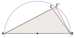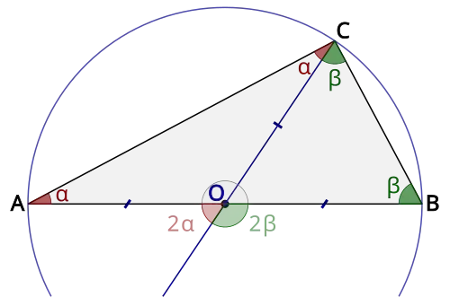 En effet, soit O le milieu de A et B, comme O est centre du cercle de diamètre [AB] passant par C, les triangles OAC et OBC sont isocèles de sommet O, d'où les égalités d'angles suivantes :