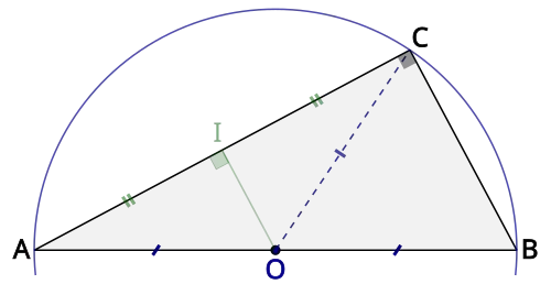 On peut aussi démontrer directement la réciproque, par exemple en utilisant les propriétés de la droite des milieux : la droite passant par le milieu O du segment [AB] et le milieu I du segment [AC] est parallèle à la droite (BC). Comme les droites (AC) et (BC) sont perpendiculaires, il en est de même des droites (AC) et (OI). La droite (OI) passe par le milieu de [AC], est perpendiculaire à (AC), c'est donc la médiatrice de A et C, d'où OA = OC. Finalement O, étant milieu de A et B, OA = OC = OB : le point O est le centre du cercle circonscrit au triangle, qui a pour diamètre [AB].