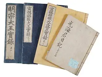 Veritable Records of Taejo of Joseon (d) Veritable Records of Hyeonjong (d) Revised Veritable Records of Hyeonjong (d) Veritable Records of Hyojong (d) Daily Records of Gwanghaegun (d) Veritable Records of Injo (d) 朝鮮王朝實錄/宣祖修正實錄 (d) Veritable Records of King Sukjong (d) Annals of King Gyeongjongdeokmun Ikmusunin Seonhyo the Great (d) Veritable Records of King Sunjo (d) 경종실록 (d) Veritable Records of Jeongjo (d) Veritable Records of Yeongjo (d) Veritable Records of Heonjong (d) Veritable Records of Seonjo (d) Veritable Records of Injong of Joseon (d) Veritable Records of Sejong (d) Veritable Records of King Munjong (d) Veritable Records of Taejong of Joseon (d) Veritable Records of Jeongjong of Joseon (d) Veritable Records of Myeongjong (d) Veritable Records of King Danjong (d) Veritable Records of Yejong of Joseon (d) Veritable Records of Jungjong of Joseon (d) Veritable Records of King Sejo (d) Daily Records of Yeonsangun (d) Veritable Records of King Seongjong (d) Veritable Records of King Cheoljong (d) |